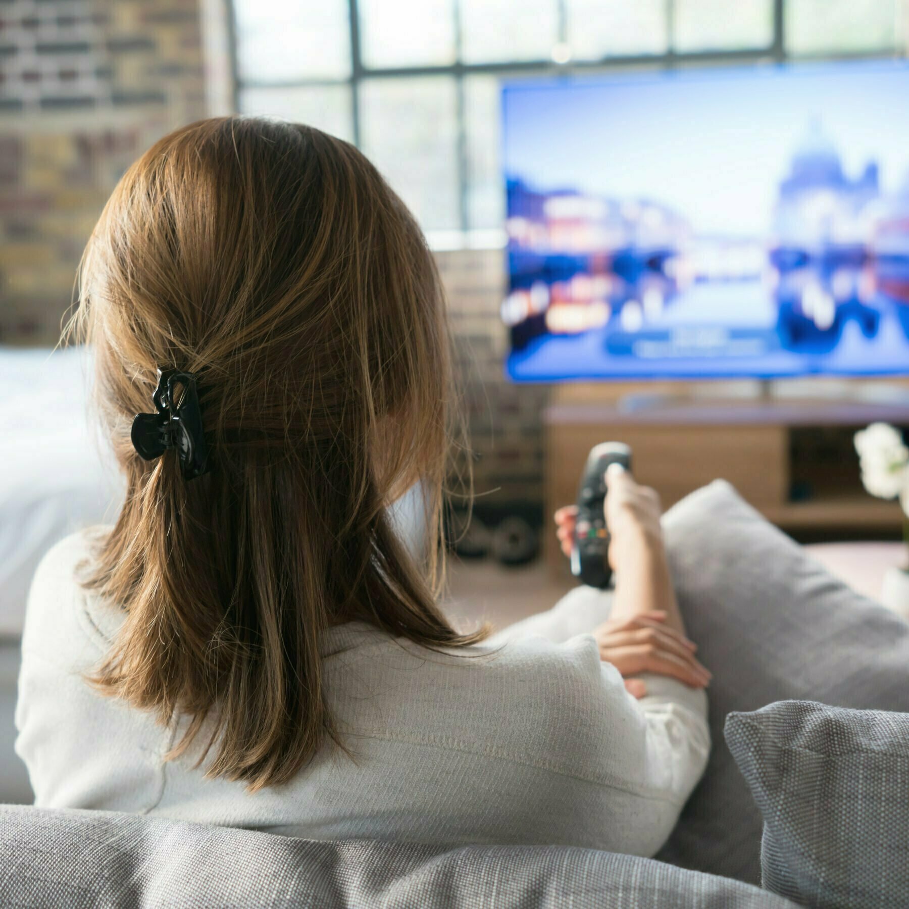 Woman watching tv at home.